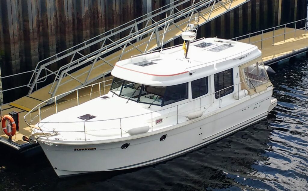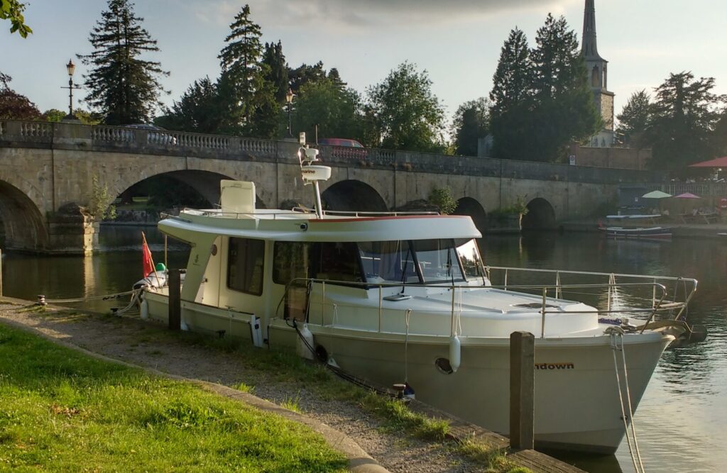 Roof hatch solar panel up, to catch sun, River Thames